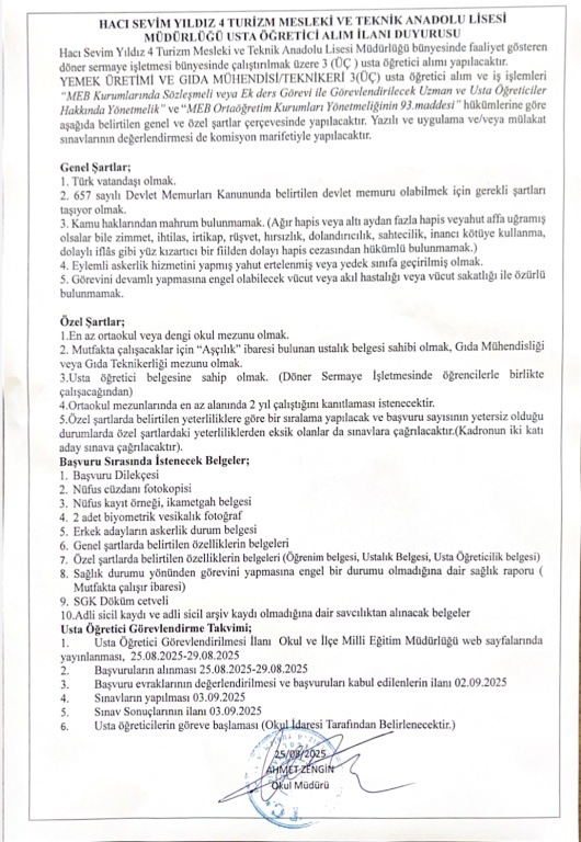 USTA ÖĞRETİCİ ALIM İLANI DUYURUSU